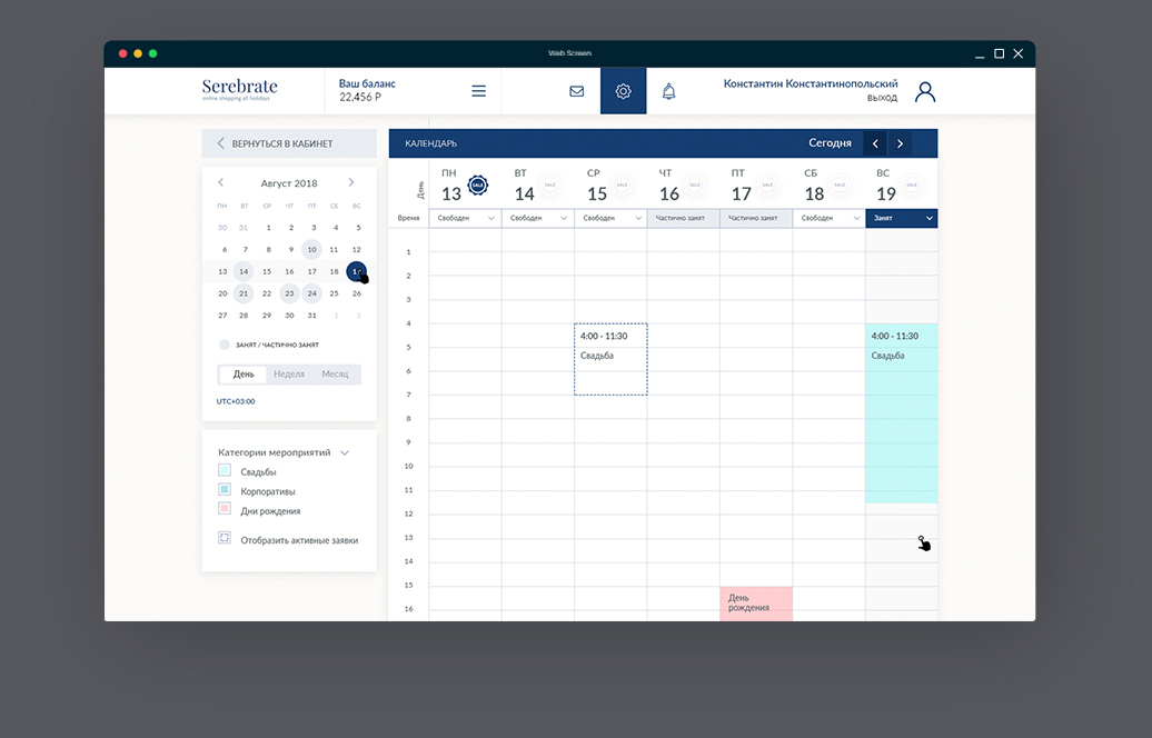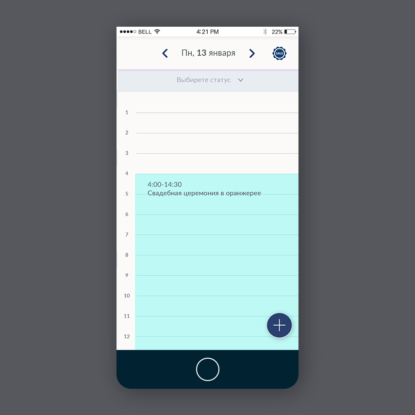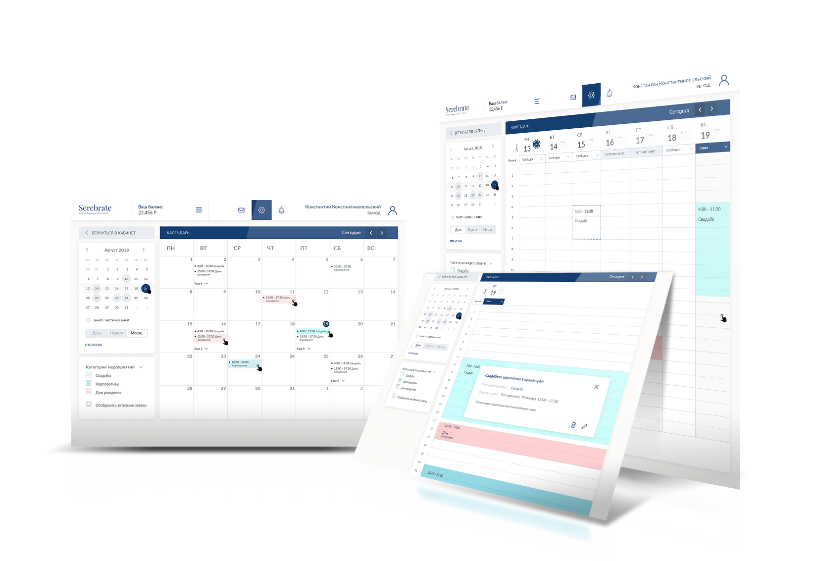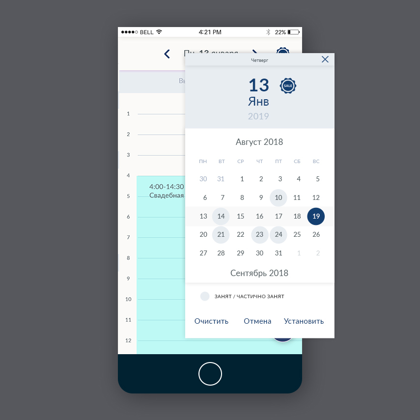 ЗАДАЧА: сделать удобный календарь понятный пользователю любого возраста. Для пользователя календарь является своевременным помощником не только как напоминание, но и как ежедневник, и как план на месяц вперед. Для клиента календарь — КАРТА свободных подрядчиков для организации мероприятий на нужную дату.