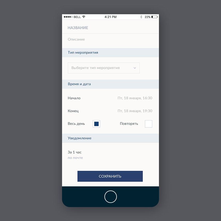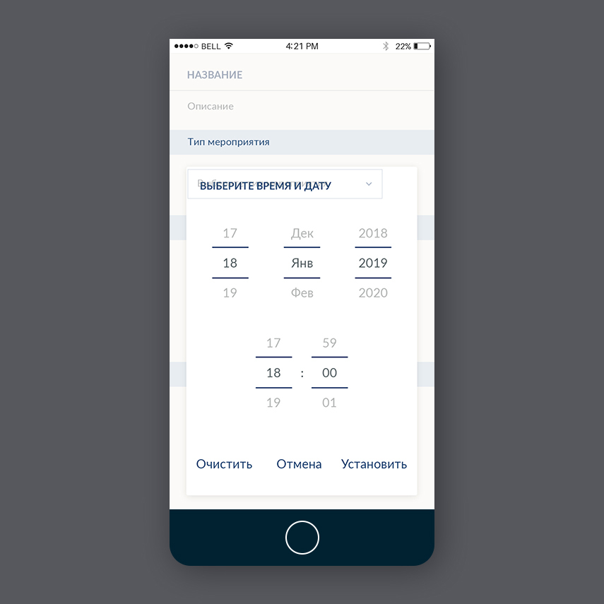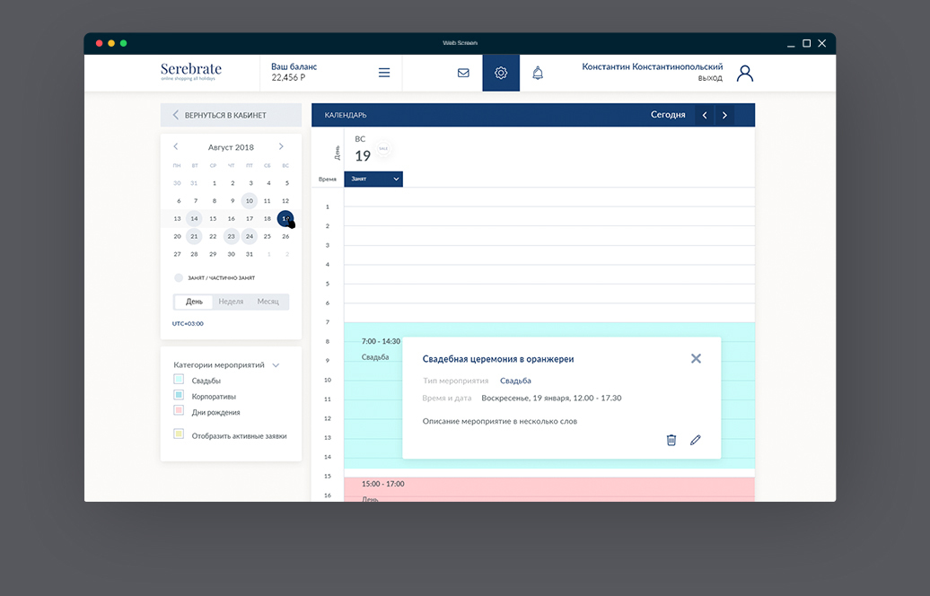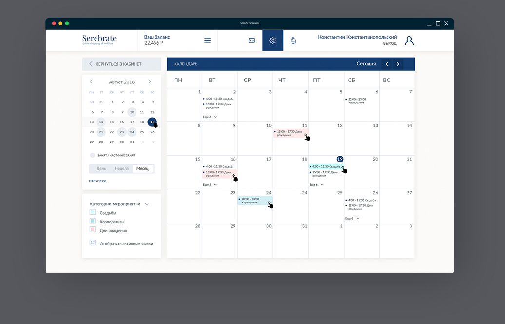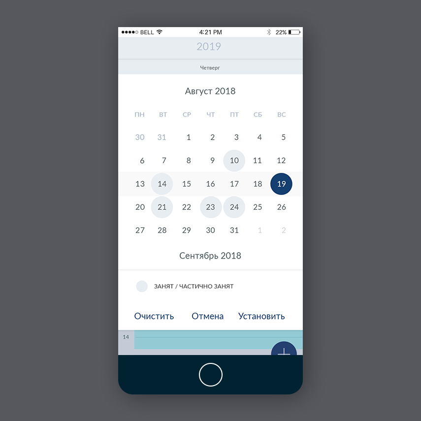 ЗАДАЧА: сделать удобный календарь понятный пользователю любого возраста. Для пользователя календарь является своевременным помощником не только как напоминание, но и как ежедневник, и как план на месяц вперед. Для клиента календарь — КАРТА свободных подрядчиков для организации мероприятий на нужную дату.