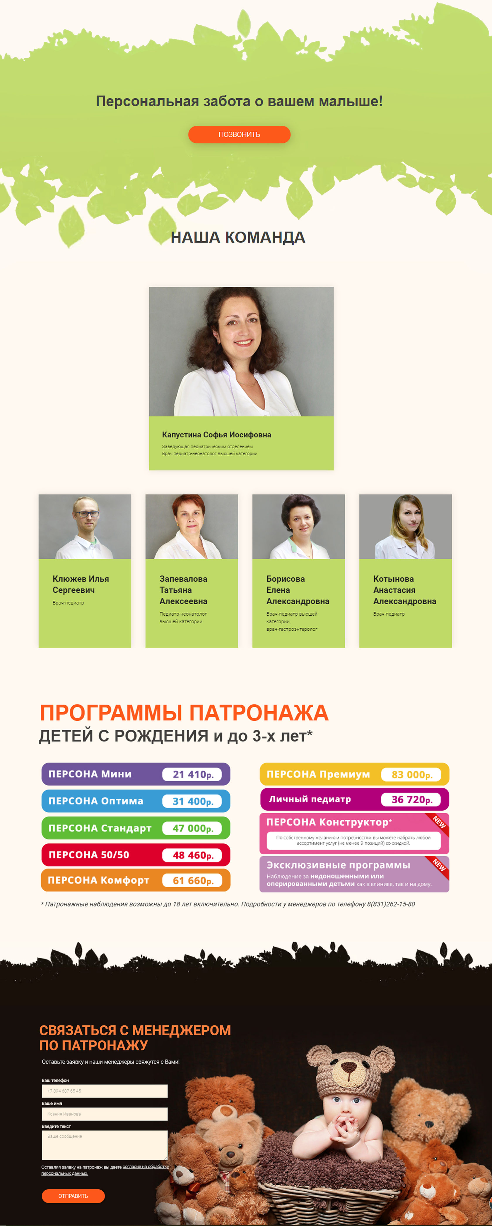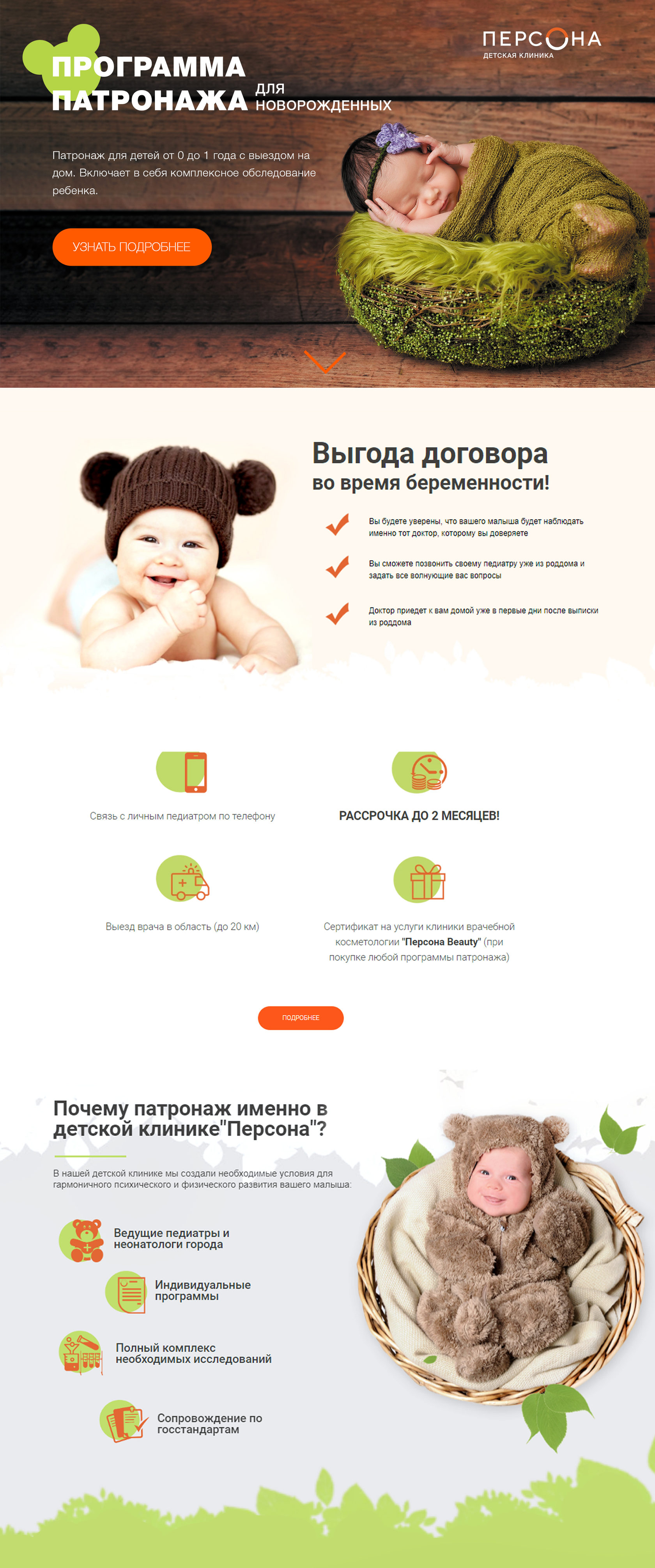Основные цвета сайта- теплый бежевый и салатовый, эти цвета встречаются и в полиграфии Персоны детство, а также хорошо сочетаются с фирменным оранжевым цветом клиники. Акцентным цветом стал сочный оранжевый из логотипа Персоны.